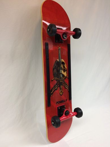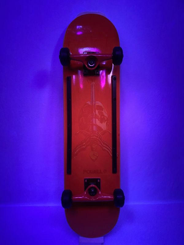 The black rails are new Powell custom cut and drilled. If displayed this board will look great at any angle as a one of a kind that will stand out in a crowd. If skated this board is ready to role. If collected as an investment, you will be one of few owners in the future with this kind of board that hasn't faded, if not the only one.